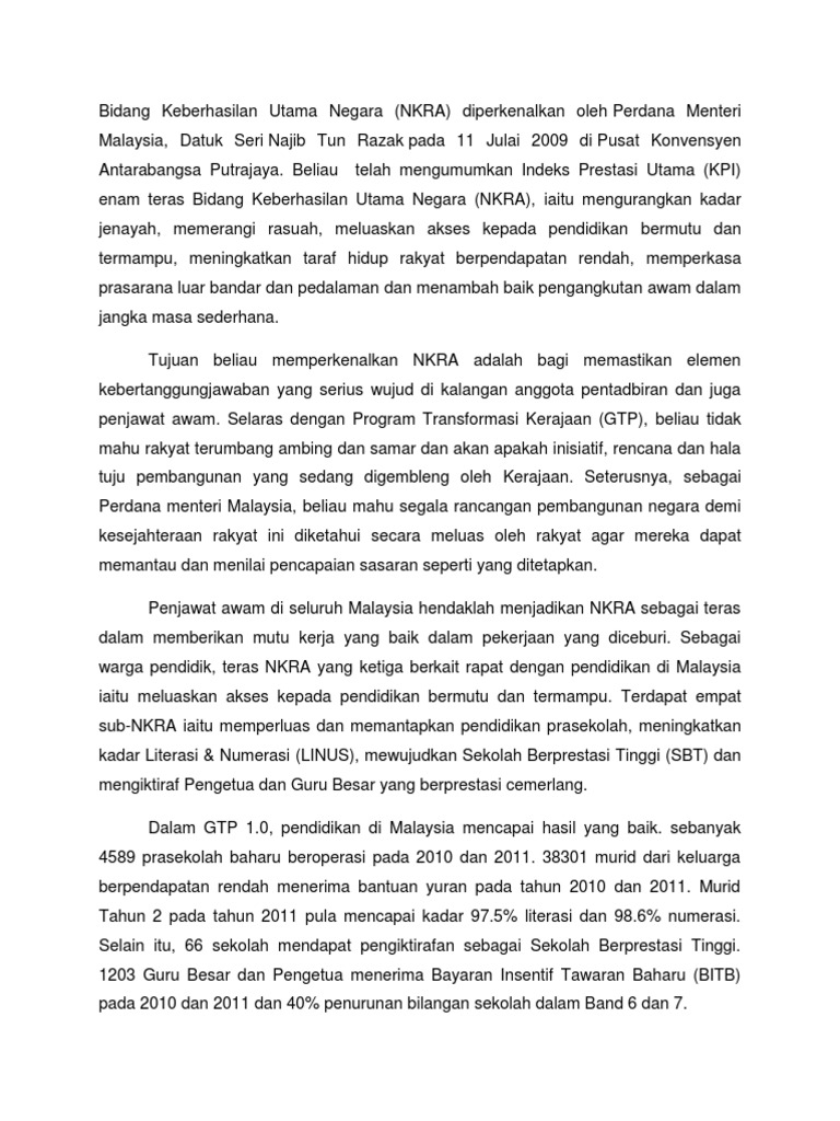 6Bidang Keberhasilan Utama Negara NKRA Pendidikan. Latar Belakang 27 Julai 2009 DatoSeri Mohd Najib Tun Razak mengumumkannya 6 bidang digariskan dan diberi keutamaan pada peringkat kebangsaan Setiap bidang ini diketuai oleh. Bidang Keberhasilan Utama Negara NKRA ini membuktikan Kerajaan di bawah pimpinan YB Dato Seri Najib Tun Razak begitu telus dan komited untuk melaksanakan transformasi perkhidmatan kerajaan yang bermutu tinggi kepada rakyat.